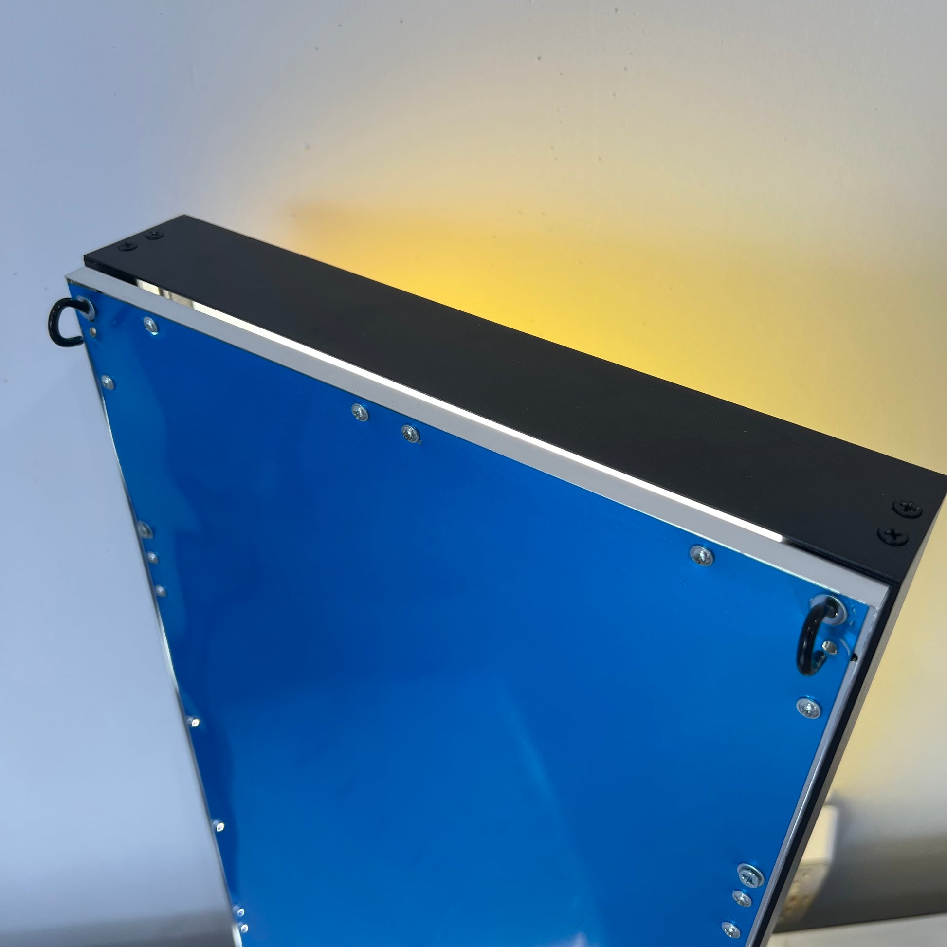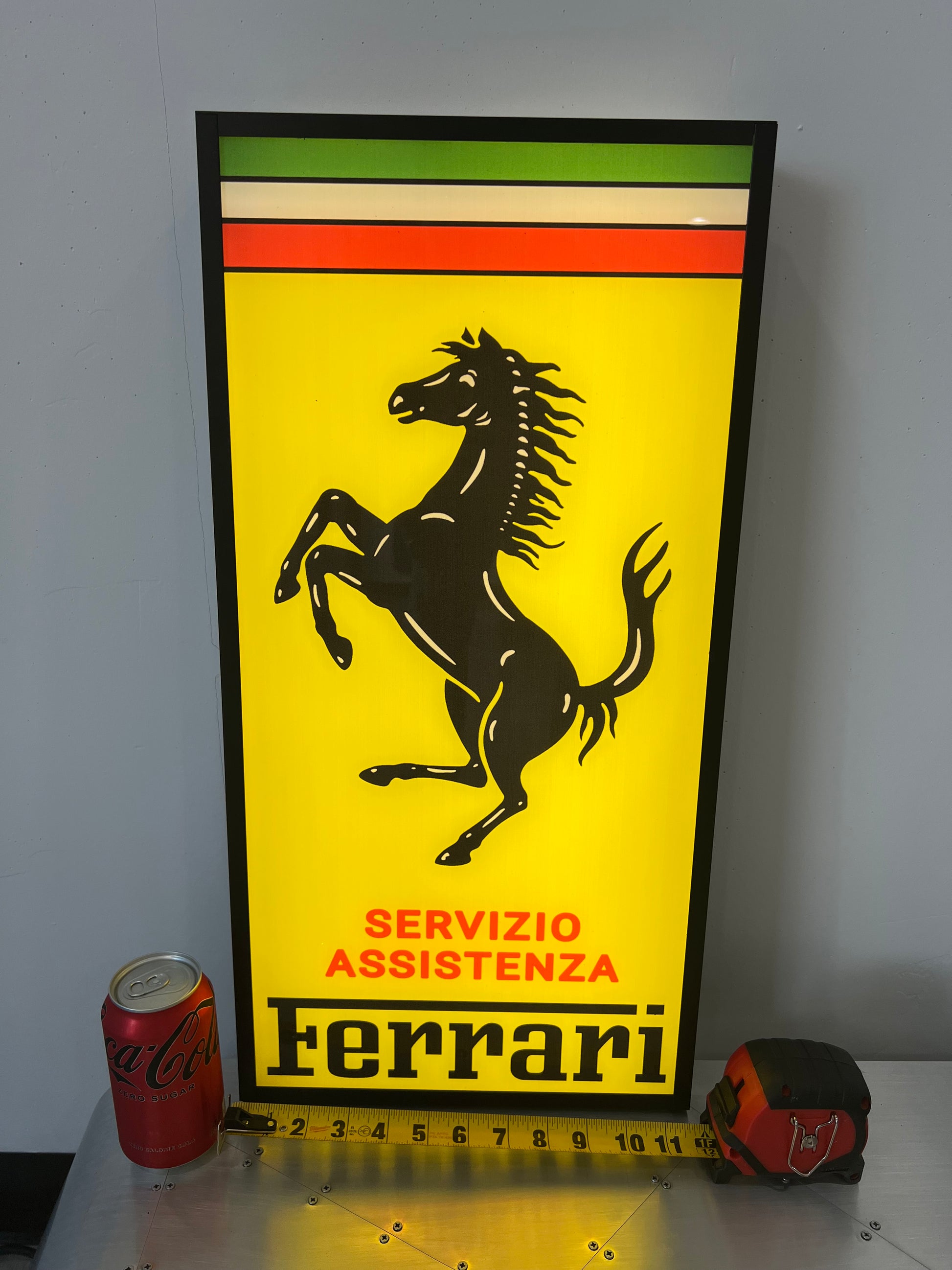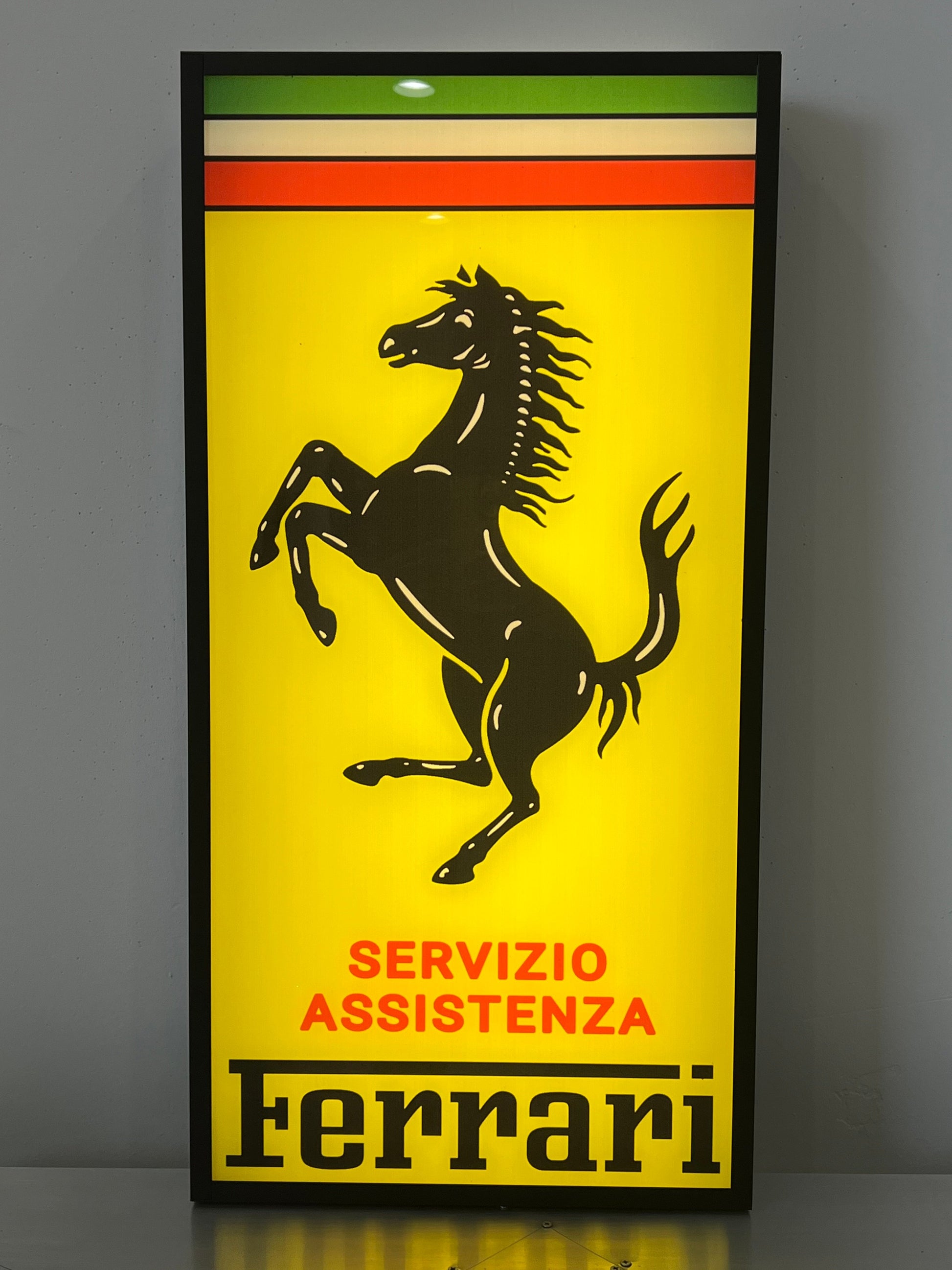 This Ferrari Servizio & Assistenza lightbox with internal LED lights, and upgraded LED driver, is ready to be mounted. Although intended for permanent mounting to a power / light switch, the unit comes with a US power plug for use in any environment, and can be easily removed or upgraded to other localized power plugs, or permanently wired into any 110-240V power source. We sourced this item from Italy direcly, and was part of a series of 3 lightboxes commisioned by the original customer. It's very sturdy, ready to hang with 2 hooks, and has a metal base.