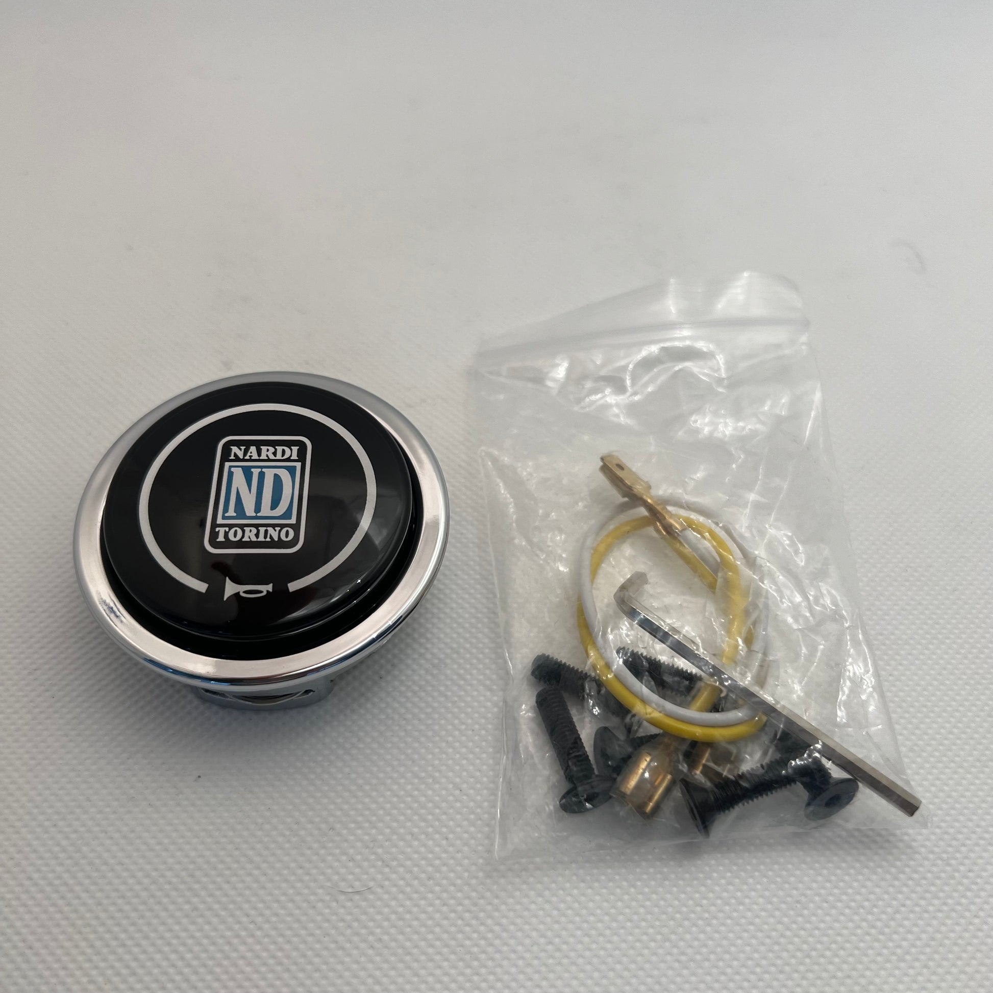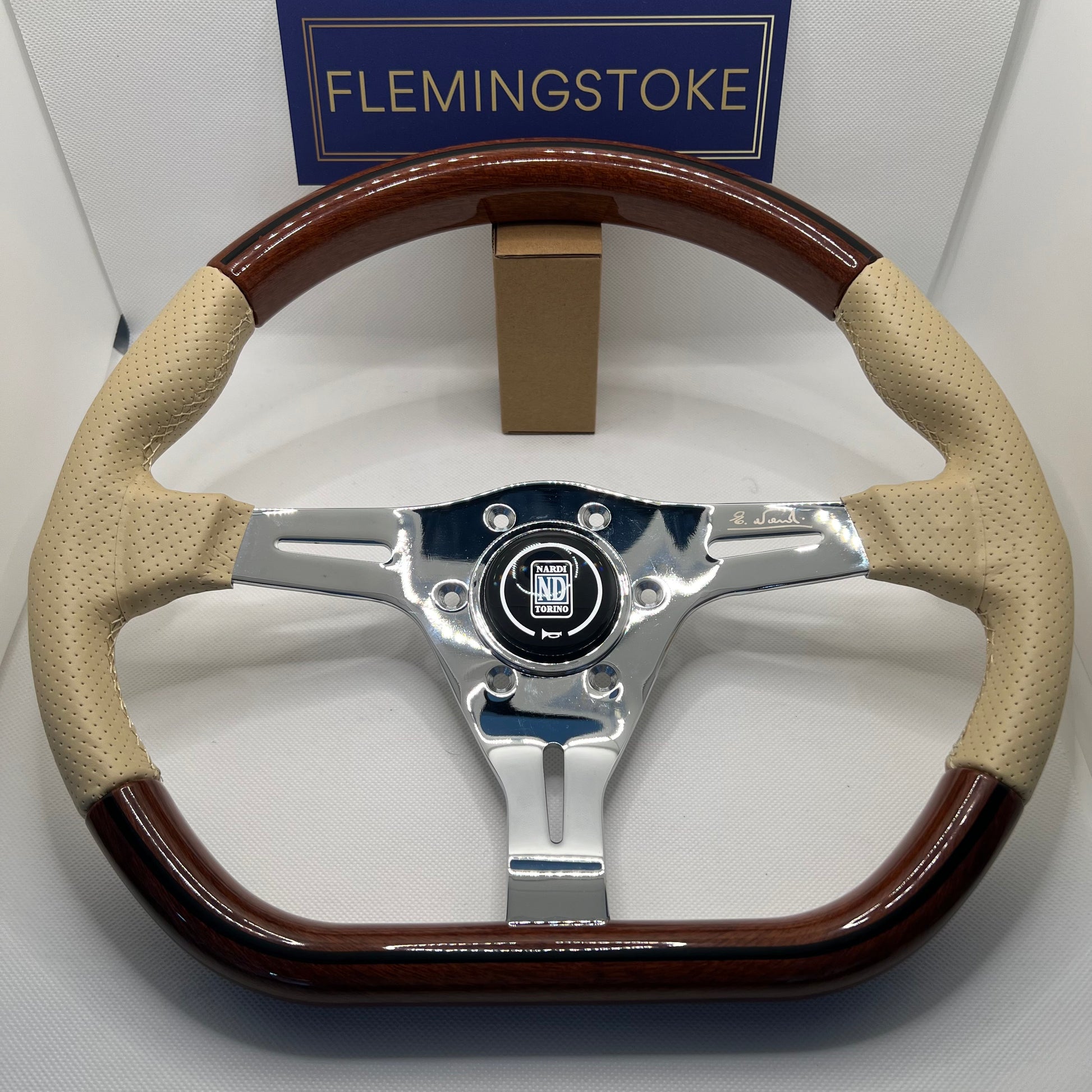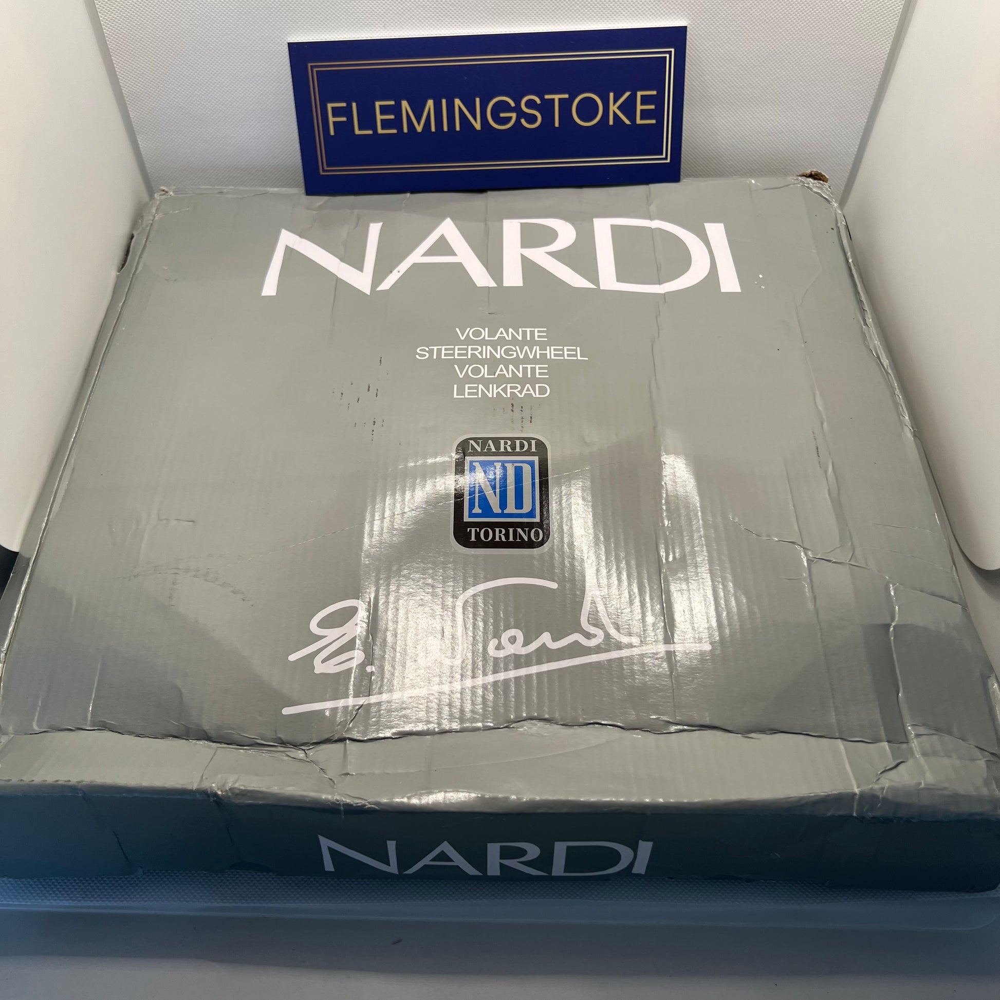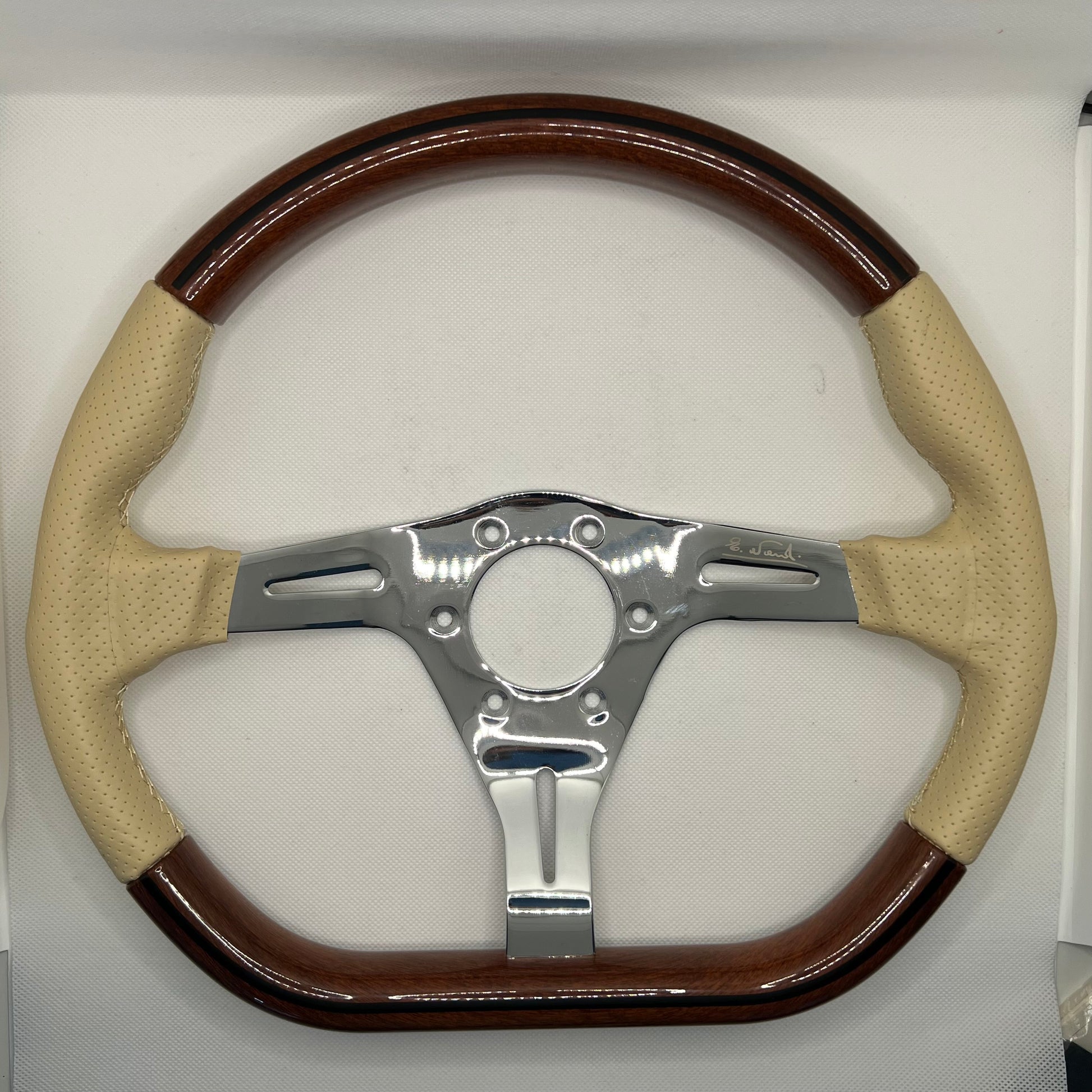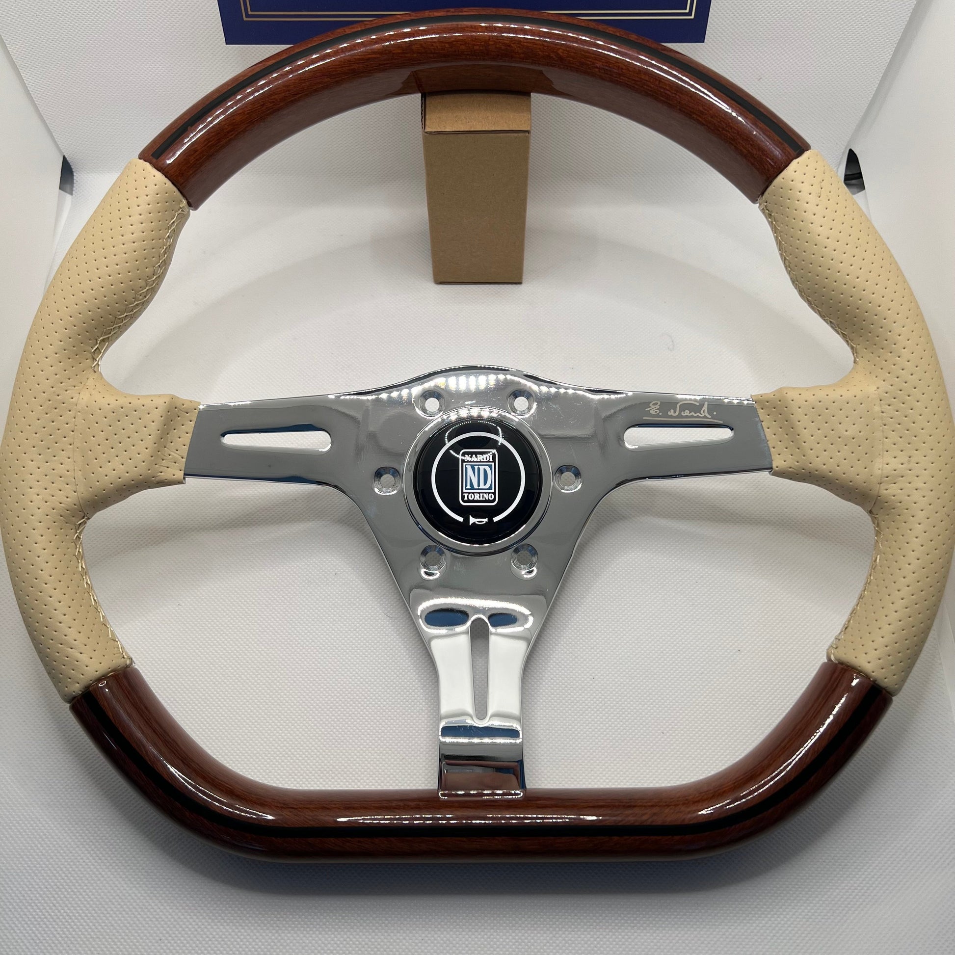 The Nardi Kallista is the steering wheel used by Pagani on the Zonda. Made by Nardi in Torino (Turin), Italy, this edition of the Kallista is finished with wood and leather over the metal frame. This version is from the 90s, sporting a much sleeker design around the horn button, compared to the newer version on the market since then. An iconic design, it makes a great upgrade to many cars, and just as well wall-mounted or in a display case to decorate your office, man-cave or ladies garage. Comes with mounting screws, horn button with cabling, a protective blue Nardi-branded cover, and with its original box and fabric bag.